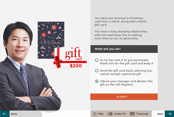 All questions are scenario based. When selecting an incorrect response, the learner will be presented with the real-life consequence for the behaviour selected. They will then be advised of the correct behaviour to ensure the gap in knowledge is closed.